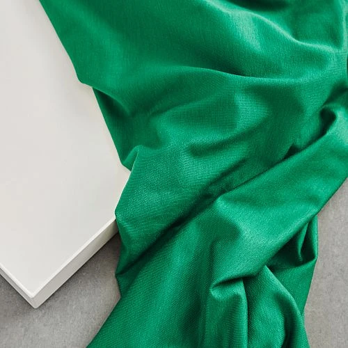 BASIC STRETCH JERSEY aus Tencel™ Lyocell Fasern ist ein exklusives, glattes und seidig weiches Single Jersey Gestrick von meet MILK. Der froschgrüne Stoff hat eine sehr feine marmorierte, glänzende Textur und eine kuschelweiche Oberfläche.