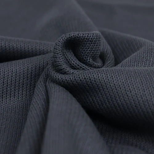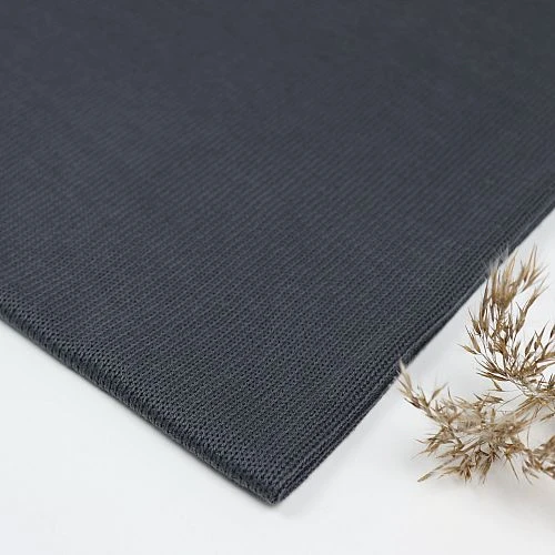 Der dunkelgraue Strickstoff hat eine Oberseite aus Strick und eine Unterseite aus Jersey für ein anschmiegsames Gefühl.