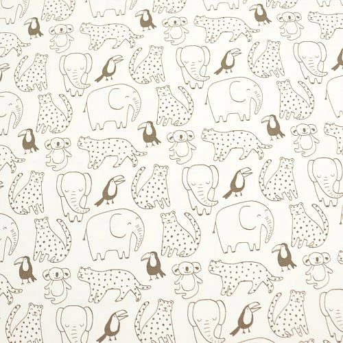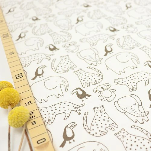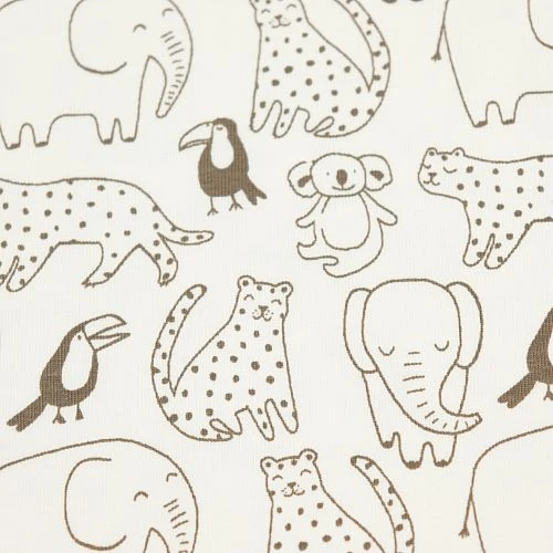 Der beigefarbene Bio Jersey mit graubraunen, handgemalten Tieren wurde im Rotations-Siebdruck mit hochwertigen Reaktiv-Farben bedruckt.