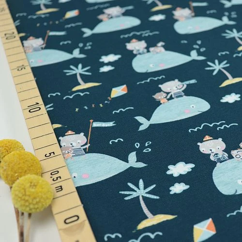 Der maritime Bio Jersey schmiegt sich fabelhaft weich an und auf Grund der Bi-Elastizität knittert er kaum. Der Stoff lässt sich wunderbar verarbeiten und ist vernäht ein komfortabler Begleiter für die Kleinsten in allen Lebenslagen. Der nachhaltige Bio Jersey eignet sich wunderbar für Baby- und Kinderbekleidung wie Kinder Shirts, Kinder Hoodies, Strandoutfits, Schlafanzüge usw. Selbstverständlich können daraus ebenfalls wundeschöne Baby- und Kinderaccessoires gezaubert werden. Außerdem sind der Kreativität zur Verarbeitung im Wohnbereich keine Grenzen gesetzt.