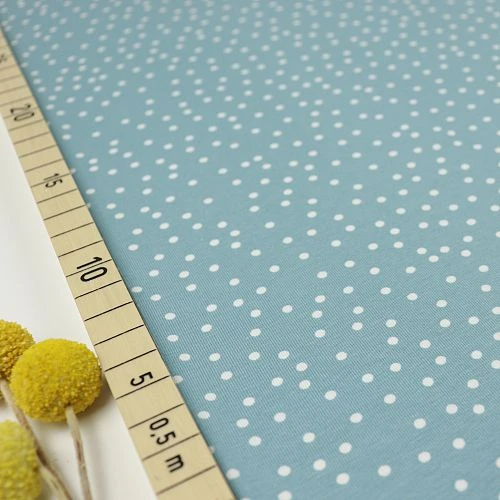 Deinen hellblauen Jersey mit weißen Punkten kannst du bequem und günstig online kaufen. Da wir deine Bestellung innerhalb von 24h versenden, kannst du schon nach wenigen Tagen deine neuen Streichelstoffe vernähen.