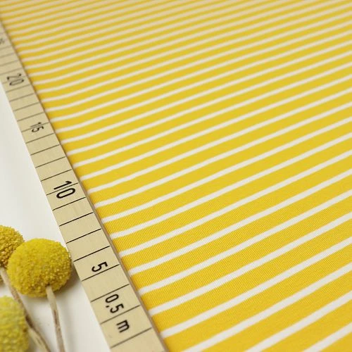 Deinen senfgelben Jersey mit weißen Streifen kannst du bequem und günstig online kaufen. Da wir deine Bestellung innerhalb von 24h versenden, kannst du schon nach wenigen Tagen deine neuen Streichelstoffe vernähen.