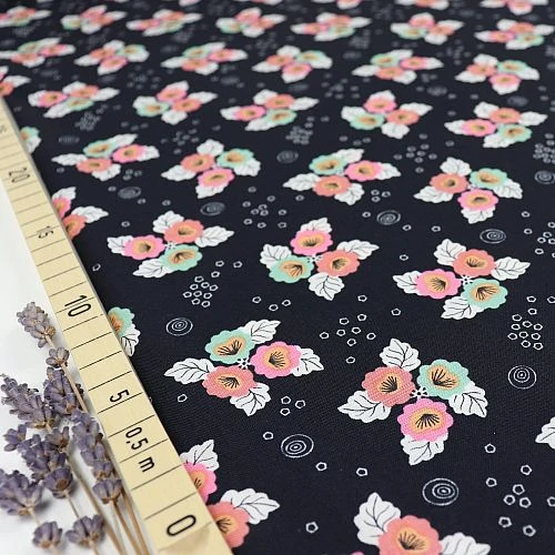 Das wunderschöne blumige Design der Blüten in türkis und pink auf schwarzem Hintergrund lässt jedes Herz höher schlagen. Auch für Wohnaccessoires wie Kissen und Bezüge ist der Stoff zu empfehlen.