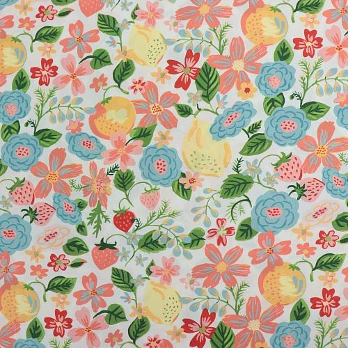 Ein üppiges Durcheinander von malerischen Blumen, Zitrusfrüchten und Erdbeeren auf einem cremefarbenen Grund.