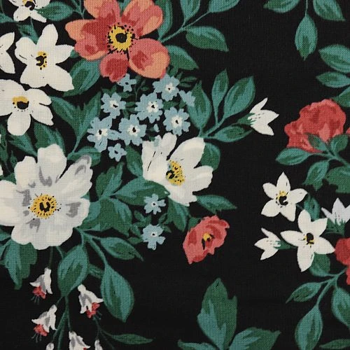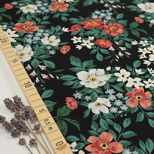 Das wunderschöne Design aus der Serie Flora by Cassidy Demkov mit weißen und roten Wildrosen auf schwarzem Hintergrund lässt jedes Herz höher schlagen. Auch für Wohnaccessoires wie Kissen und Bezüge ist der Stoff zu empfehlen.