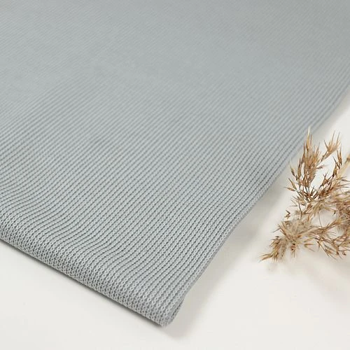 Der hellgraue uni Strickstoff hat eine Oberseite aus Strick mit Rippenmuster und eine glatte Unterseite für ein anschmiegsames Gefühl. Außerdem wird der Strick dadurch stabilisiert und kann so nicht ausleiern.