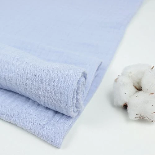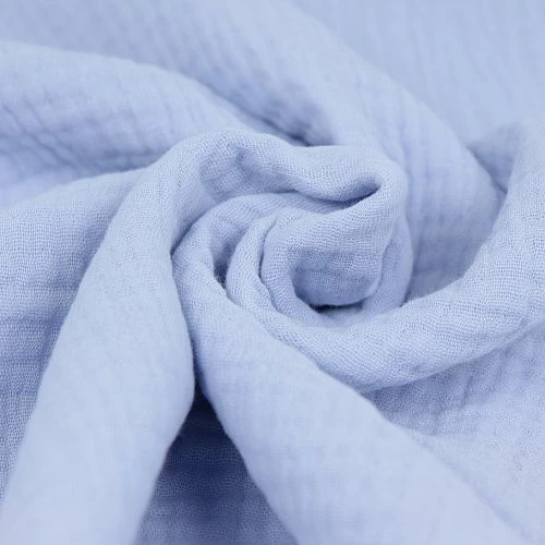 Unser hellblauer Bio Baumwollmusselin hat einen besonders weichen Griff. Der luftig, lockere Stoff besteht aus drei punktuell verbundenen Schichten und hat eine gecrinkelte Oberfläche. Vorder- und Rückseite sind gleich.