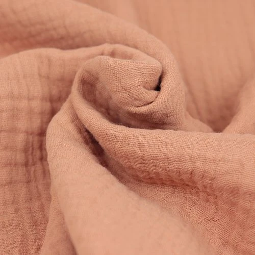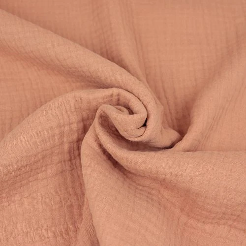 Unser pfirsichfarbener Bio Baumwollmusselin hat einen besonders weichen Griff. Der luftig, lockere Stoff besteht aus drei punktuell verbundenen Schichten und hat eine gecrinkelte Oberfläche. Vorder- und Rückseite sind gleich.